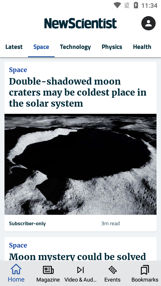 可以查看全球最新科学杂志的应用,New Scientist杂志app订阅免费版,包含了播客,视频,技术,空间,物理,健康多种内容,打开就可以直接阅读,软件是英文的界面,用来学习英文也是很不错的。
