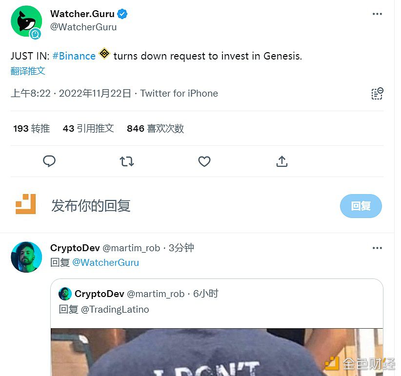 Watcher.Guru发推特透露,“Binance拒绝了投资Genesis的请求。”