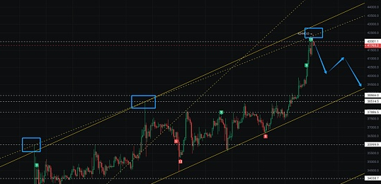 既然大饼再次触及到了前方高点形成的压力位,并且再次回落,那么-如果按照理论来说的话,下个目标位就是上升通道下边界的这个位置,可以先看到40600-40000这个位置,如果支撑不住的话,下一个位置就是38000-38500这个位置。上涨也是有节奏的,所以即使下跌,也不会一下跌倒你想要的位置,牛市多急跌,大家可以注意一下逢低抄底的机会。