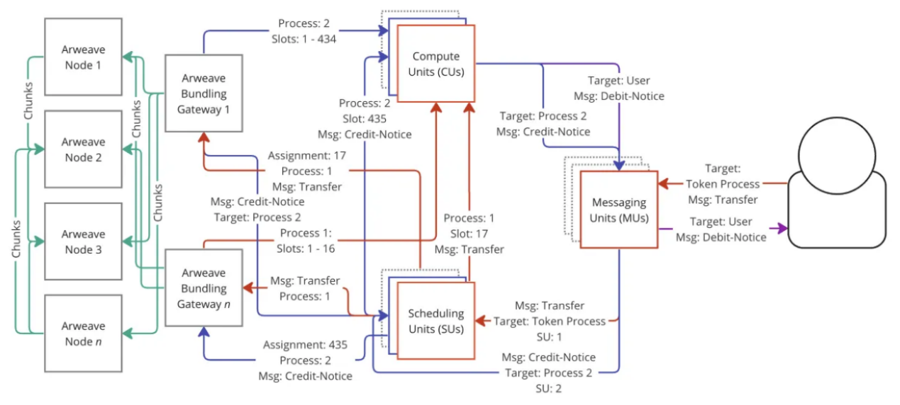 基于 SCP 的核心理念,AO + Arweave 系统架构实现了在链上存储(共识)与链下计算的有效分离: