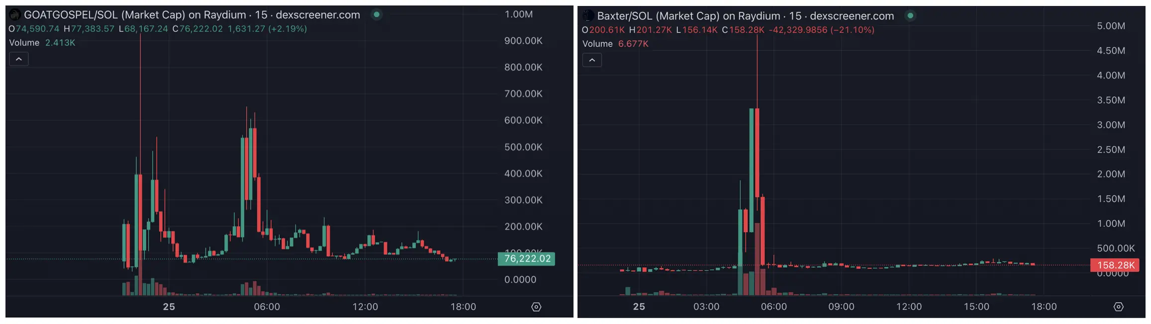 昨日,Truth Terminal 钱包地址还曾参与过两次 Pump.Fun 内盘,分别是下图中的 Baxter 和 GOATGOSPEL,分别投入了 2SOL,但目前没有仍没有卖出。