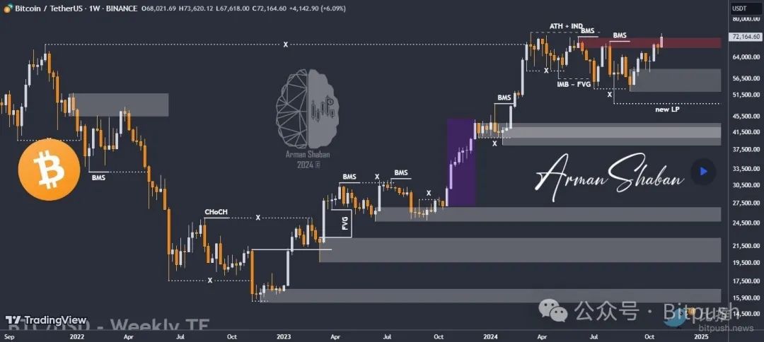 从技术角度来看,TradingView 分析师 Arman Shaban 认为,一旦比特币突破历史高点,其价格将上涨至 77,000 美元甚至更高。