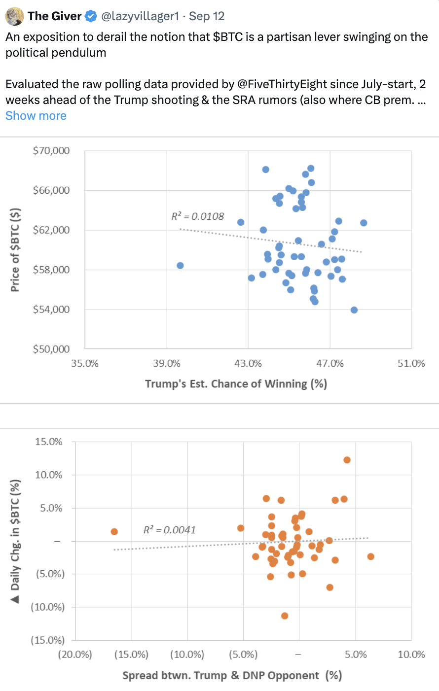 1)选举的方向并不会驱动价格依赖的结果;相反,比特币目前被用作对冲特朗普胜利的流动性工具。