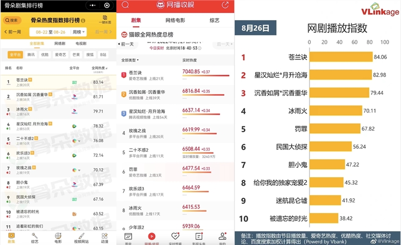 此外,《苍兰诀》在骨朵、猫眼、Vlinkage、德塔文、艺恩、灯塔等多个数据平台持续霸榜。