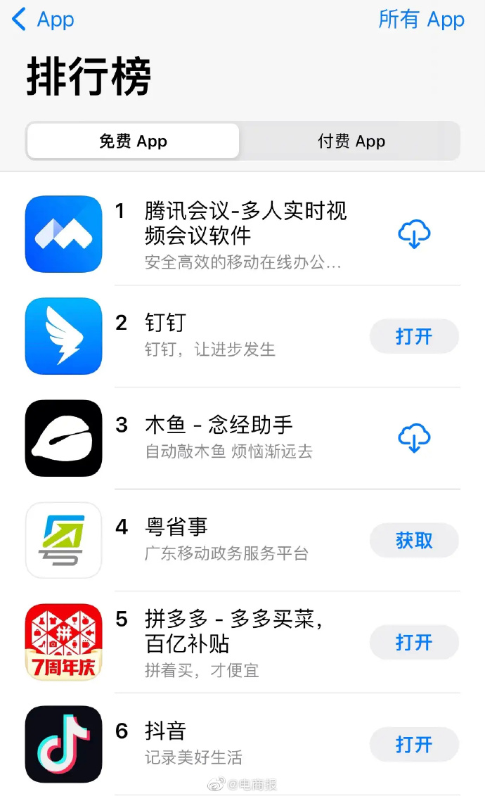 有意思的是,这种新的“修行”方式直接把一款APP送上了AppStore排行榜第三。据最新的AppStore排行榜信息显示,目前,腾讯会议是免费APP中排名第一的应用,其次是钉钉。而一款名叫木鱼的APP竟然超过了拼多多、抖音等应用,排到了第三名。